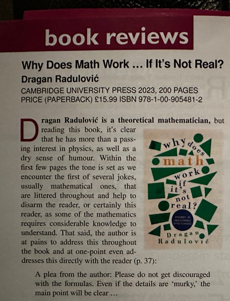 My review of Dragan Radulović’s inquisitive work, Why Does Math Work … If It’s Not Real? has been published in this month’s Mathematics Today. I really enjoyed this whistle-stop tour of many key mathematical concepts. If you are scientifically or mathematically curious, I think you will too.